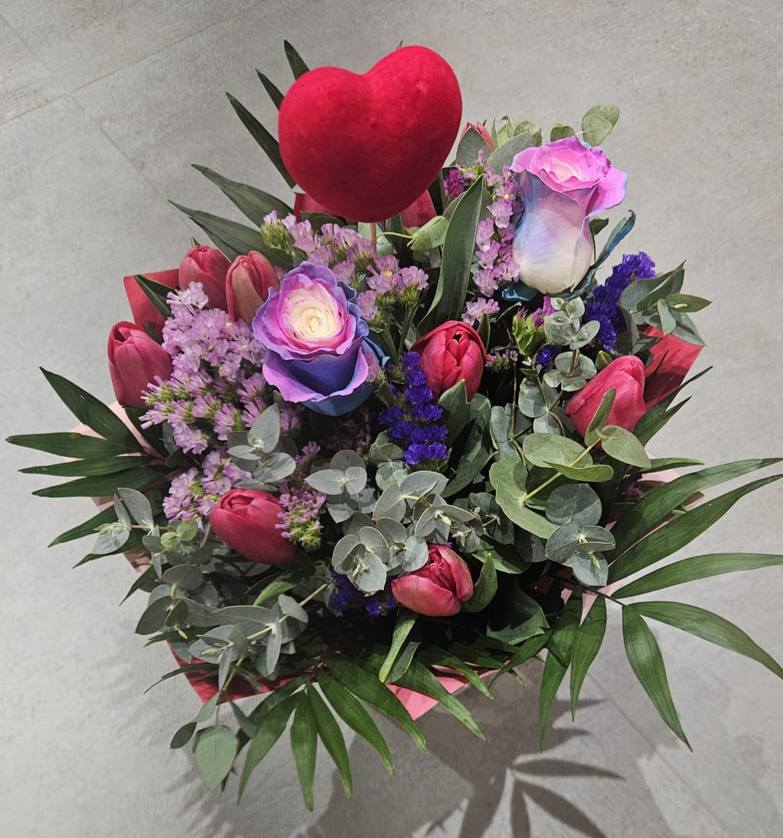 Un bouquet elegante y lleno de encanto que combina la pasión de las rosas con la delicadeza de los tulipanes. Cada flor ha sido cuidadosamente seleccionada para crear una armonía perfecta de colores y texturas, ideal para sorprender en cualquier ocasión especial. Su diseño fresco y sofisticado transmite amor, alegría y buen gusto, convirtiéndolo en el regalo perfecto para aniversarios, cumpleaños, celebraciones o simplemente para decir “estoy pensando en ti”